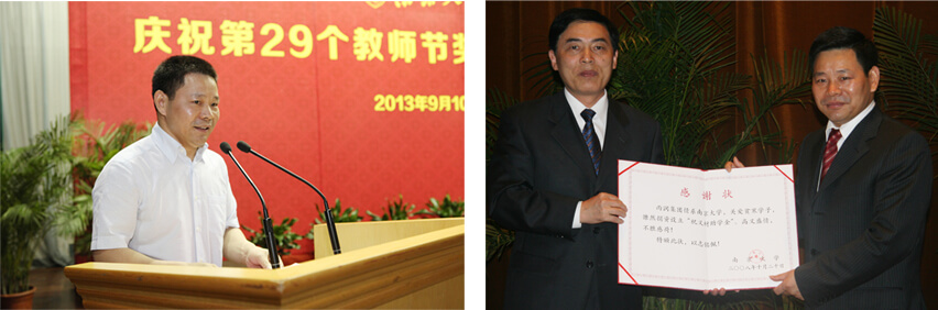 2013年9月10日下午,在南京大學(xué)“慶祝第29個(gè)教師節獎教金頒獎典禮”上,由雨潤控股集團命名的首屆“雨潤教學(xué)終身成就獎”,在其鼓樓校區大禮堂正式揭曉,兩位長(cháng)期堅持在教學(xué)第一線(xiàn)的老教授——盧德馨和王守仁,共同分享這一殊榮。南京大學(xué)校長(cháng)陳駿和雨潤控股集團董事長(cháng)祝義財一起為獲獎?wù)哳C獎,每人各獲獎勵金額20萬(wàn)元整。這是迄今為止南京大學(xué)頒出的數額最高的單項獎教金。